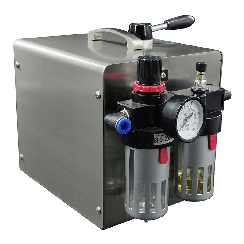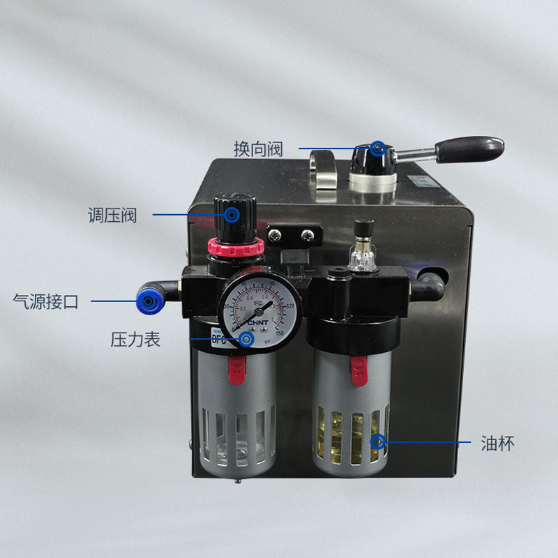把外接氣源的連接管插入快速【氣源接口】, 調(diào)節(jié)【調(diào)壓閥】, 使壓力達(dá)到工作指標(biāo), 在【油杯】中加入壓縮空氣專用油